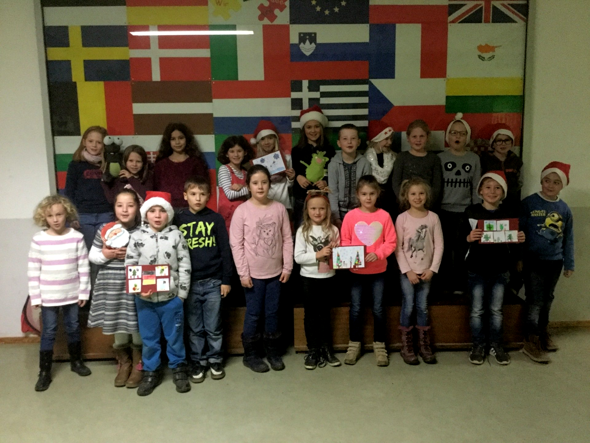 Die Klasse 2c verschickte am 10.12.19 kleine Weihnachtsüberraschungen und selbst gebastelte Karten an Schulen in Slowenien, der Tschechischen Republik, Belgien und Österreich. Die Idee zu diesem Projekt entstand während eines Kontaktseminars von eTwinning, einer Online-Plattform zur Durchführung gemeinsamer Projekte mit (europäischen) Partnerschulen bzw. -klassen. Dort lernten sich die Projektpartner kennen und schmiedeten erste Pläne zur Umsetzung des gemeinsamen Projekts: jede Klasse verschickt an jede der vier Partnerklassen einen Weihnachtsgruß, natürlich in der jeweiligen Landessprache. Im Projektbereich auf eTwinning erhalten alle teilnehmenden SchülerInnen dann bald Gelegenheit, sich anzuhören, wie die Grüße in der jeweiligen Landessprache klingen. Mit großer Freude gestalteten die SchülerInnen eigene Weihnachtskarten und bastelten kleine Rentierlollies - insgesamt mehr als 80 Stück. Nun warten alle sehr gespannt auf die Post aus den anderen Ländern.