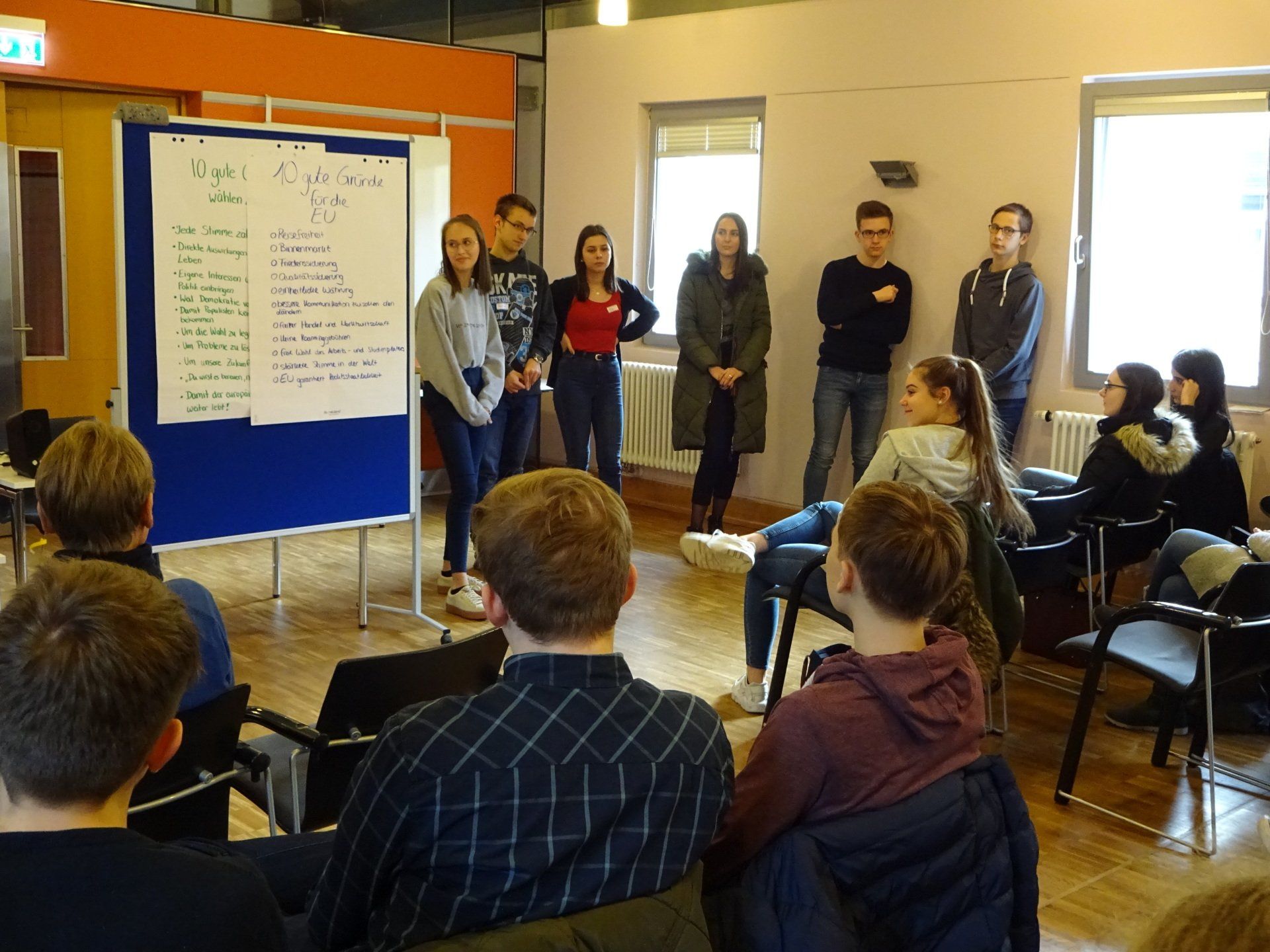 Wer wollte, konnte, so wie wir, mit einer Andacht in der Kapelle in den neuen Tag starten. Im Anschluss ging es mit den Workshops zu den Themen „10 Gründe, warum man wählen gehen sollte“, „10 Gründe für den Verbleib in der EU“, sowie „10 Verbesserungsvorschläge an die EU“ weiter. Dabei kamen natürlich wieder interessante Anregungen zum Vorschein.