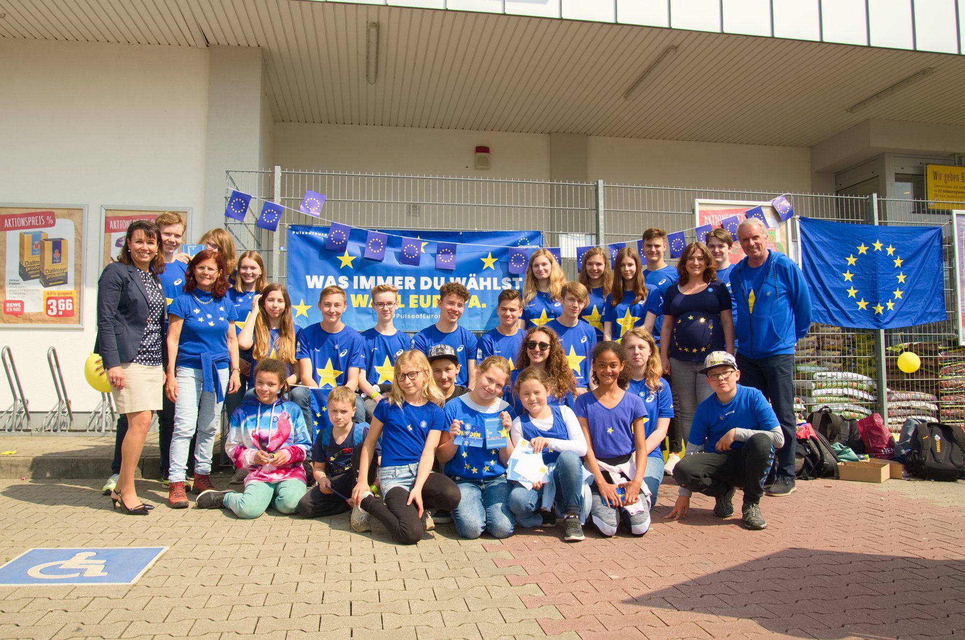 Ausgestattet mit Bannern, Europaflaggen und einer Fülle von Werbematerialien zur Europawahl entwickelten die Schüler der Dauborner Europaschule großen Spaß, auf die Einkäufer*innen zuzugehen und mit ihnen ins Gespräch zu kommen.