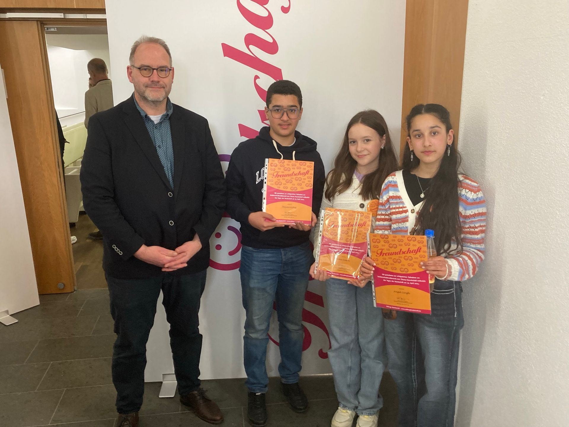 Junge Schreibtalente geehrt: 100 hessische Schülerinnen und Schüler wurden am 19. April im Museum Wiesbaden für ihre Briefe zum Thema Freundschaft im Rahmen des 6. Schülerschreibwettbewerbs der Stiftung Handschrift von Kultusminister Armin Schwarz ausgezeichnet – darunter auch Nora Simon, Angel Singh und Rayan Achiq der Freiherr-vom-Stein-Schule Dauborn.