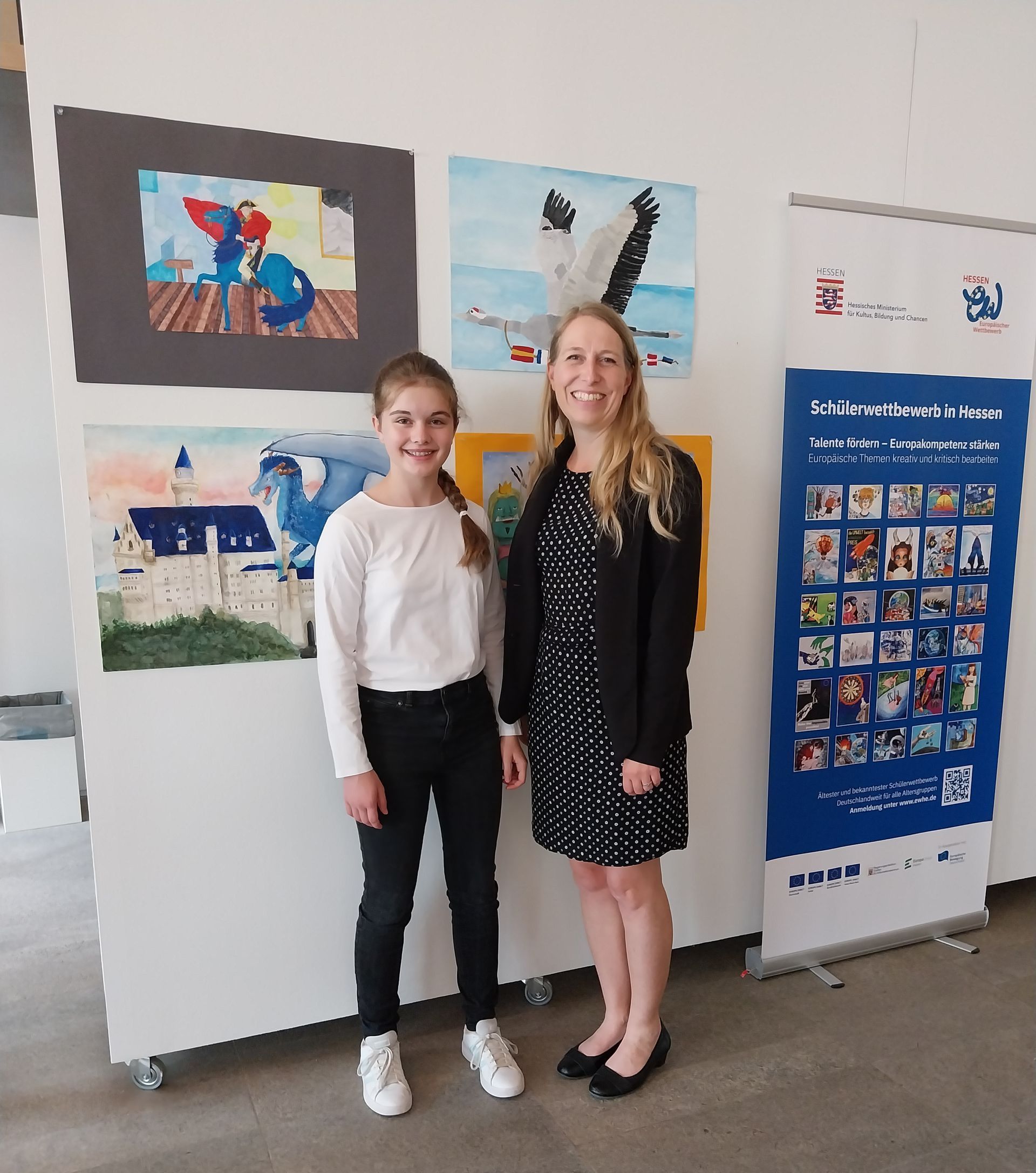 Direkt im Anschluss an die Projektwoche machte sich Mia Hilgert aus der 6Ga mit ihrem Vater und ihrer Kunstlehrerin Tanja Simon auf den Weg nach Wiesbaden in den Hessischen Landtag. Dort fand die diesjährige Bundesverleihung des 71. Europäischen Wettbewerbs 2024 statt, an dem insgesamt 61.778 Schülerinnen und Schüler bundesweit teilgenommen haben. Mia konnte mit ihrem Wettbewerbsbeitrag die Jury überzeugen und einen von 434 Bundespreisen entgegennehmen. Nach der Veranstaltung bildete eine interessante Führung durch den Hessischen Landtag einen gelungenen Abschluss.