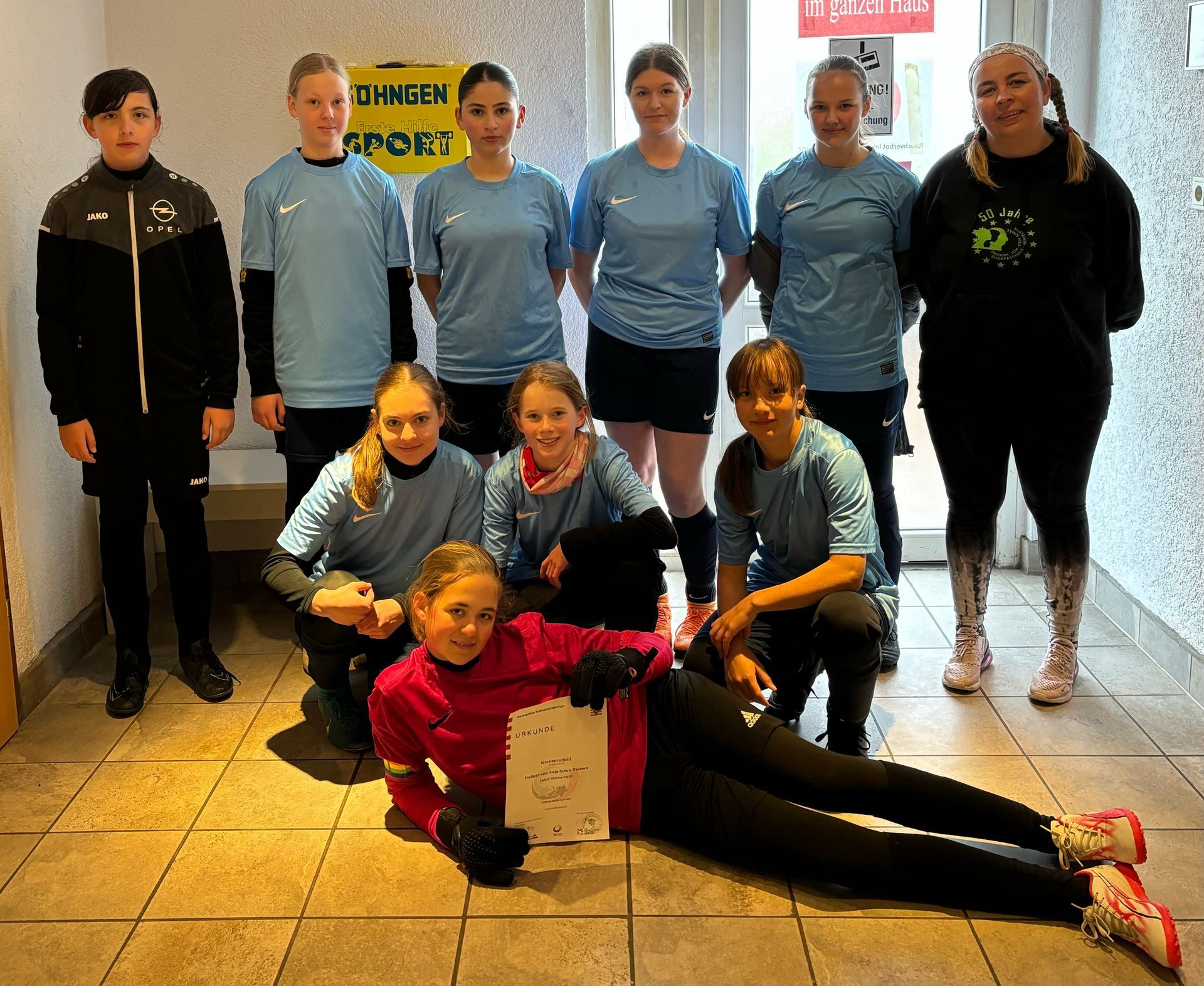 Die Schulmannschaft der Freiherr-vom-Stein Schule erkämpfte sich am 24.04.2024 beim Kreisentscheid Mädchenfußball in Limburg den 2. Platz. Im ersten Duell gegen die Marienschule Limburg kam es zu schönen Spielzügen im Mittelfeld der läuferisch und technisch starken Alina Suraev, Stella Lottermann und Lena Kaukalis. So hatten unsere Mädels den Siegtreffer auf dem Fuß, konnten nur die Chancen nicht nutzen. Durch eine überzeugende Defensivleistung um die starke Emma Schmitt im Tor sowie die souveräne Abwehrkette mit Auree Marcy, Nopl Hamdin und Lea Melcher konnte das 0:0 gesichert werden. Zu Beginn des zweiten Spiels verletzte sich die starke Auree Marcy leider so schwer (Gute Besserung!), sodass die Begegnung gegen die Taunusschule Bad Camberg unterbrochen werden musste. Im weiteren Verlauf zeigte sich die Stärke des mit einigen Stützpunktspielerinnen gespickten Teams, als die Taunusschule zwei Tore schön herausspielte. Die Mädels der Freiherr-vom-Stein Schule gaben nie auf. Neben Magdalena Stein, Marlene Masera und Lea Schnierer im Mittelfeld kämpften alle für unser Team und die FvSS konnte schließlich ebenfalls noch zwei weitere Tore erzielen. So verwandelte Alina Suraev einen indirekten Freistoß zum 1:2 und Torfrau Emma Schmitt einen Elfmeter zum 2:2 Endstand. Da die Taunusschule das letzte Spiel mit 2:0 gegen die Marienschule gewann, sicherte sie sich den ersten Platz gefolgt von der Freiherr-vom- Stein Schule.
