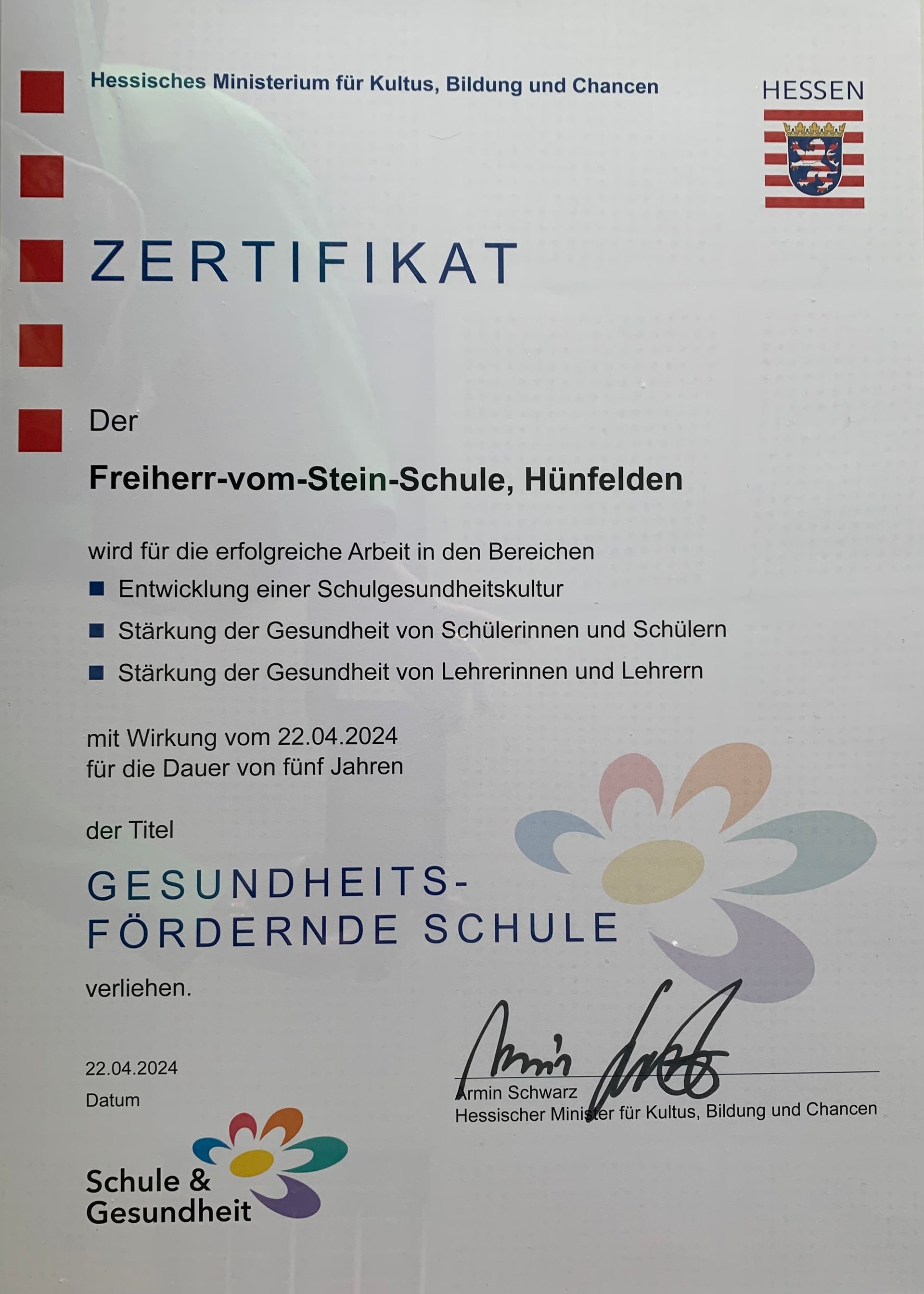 Im Rahmen seines Besuches an der Freiherr-vom-Stein-Schule am 22.04.2024 überreichte der Minister für Kultus, Bildung und Chancen Armin Schwarz der Schulleiterin Judith Lehnert das Gesamtzertifikat „Gesundheitsfördernde Schule“.