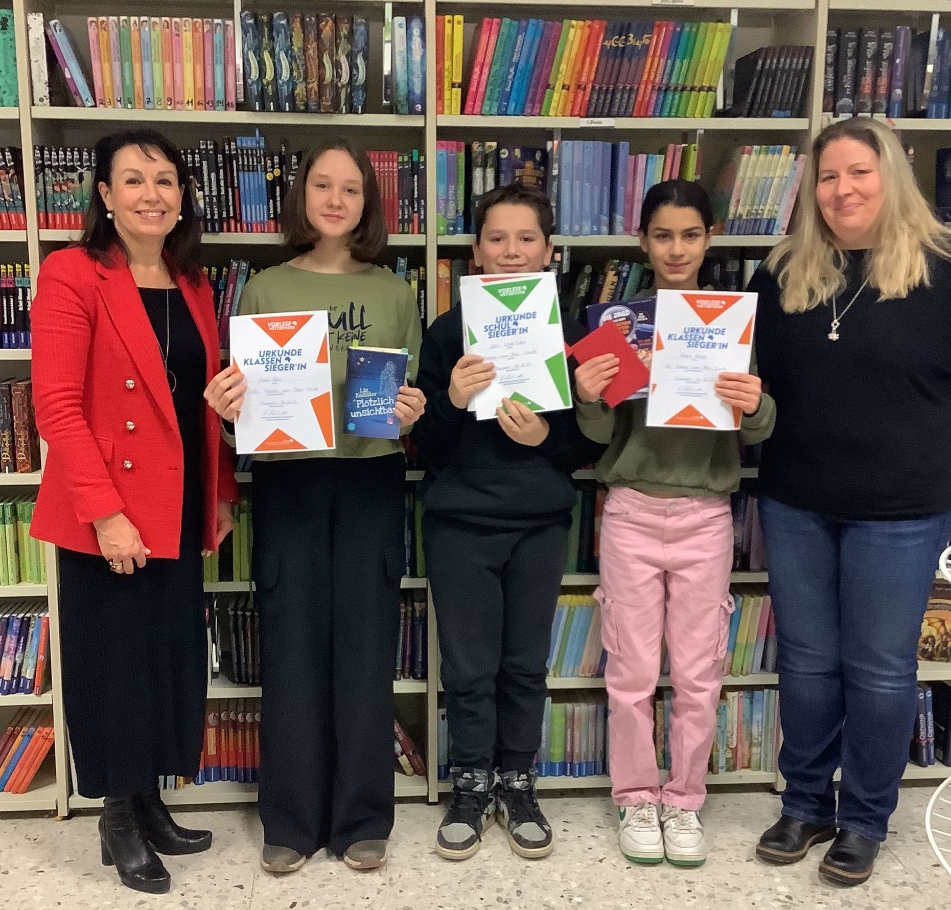 Auch in diesem Jahr zeichnete Schulleiterin Judith Lehnert die Siegerinnen und den Sieger aus und beglückwünschte sie zu ihren gelungenen Buchvorstellungen. Alle Siegerkinder dürfen sich über Buchgutscheine freuen, die der Förderverein der Schule gestiftet hat.