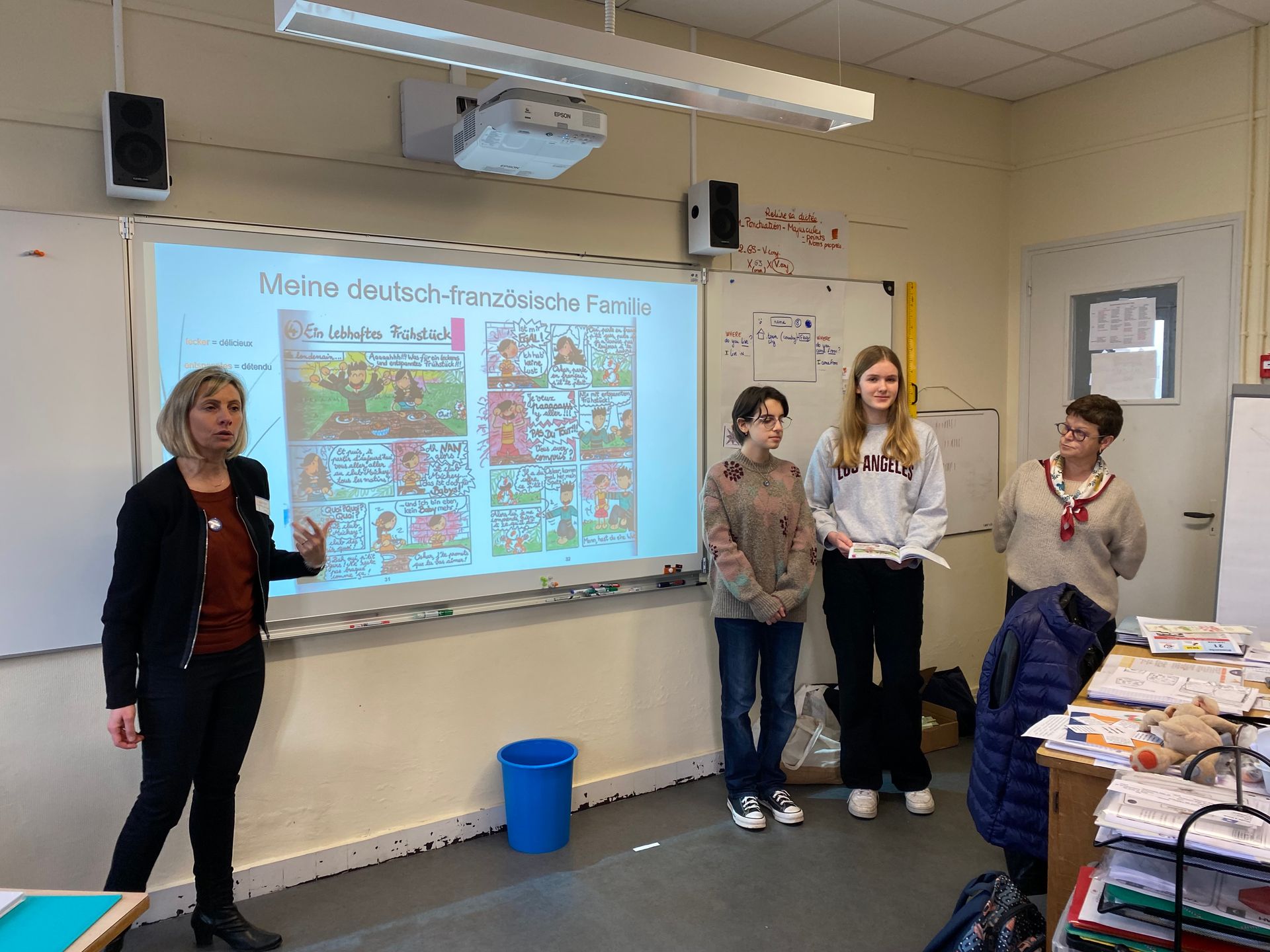 An einem Tag in der ersten Praktikumswoche begleiteten zwei Praktikantinnen die Vertreterinnen und Vertreter des Partnerschaftsvereins aus Le Barp in zwei Grundschulen. Die Entwicklung der Partnerschaft zwischen Frankreich und Deutschland sollte kindgerecht vorgestellt sowie ein Schnupperkurs Deutsch mit dem Wortschatz zum Thema „Deutsches Frühstück“ durchgeführt werden. Das Ziel dieses Besuchs bestand darin, französische Kinder für das Erlernen der deutschen Sprache zu motivieren. Die beiden deutschen Mädchen unterstützten die Vereinsvertreterinnen und -vertreter, indem sie als Sprachvorbild dienten und die deutschen Passagen eines deutsch-französischen Comics vorlasen.
