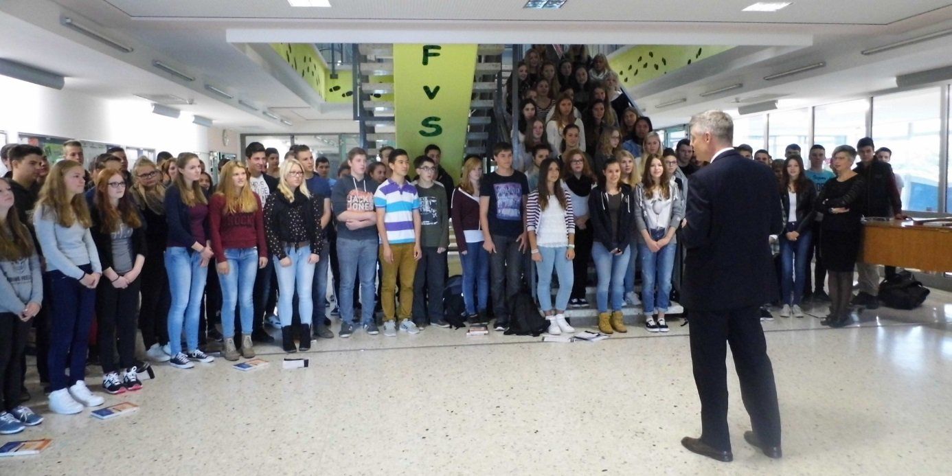 Als neu ins `Schulentwicklungsprojekt Europaschule‘ aufgenommene Schule, begrüßte der Jahrgang 10 schwungvoll mit der Europahymne. Begeistert vom Liedvortrag der Klassen ließ es sich Dr. Lösel, selbst Musikpädagoge, nicht nehmen, mit den Schülerinnen und Schülern einen Sprechkanon einzustudieren. Einen solch intensiv musikalischen Auftakt hatten auch die Dezernentin des Staatlichen Schulamts Frau Engelhardt sowie Herr Veyhelmann und die Vertreter des Schulelternbeirats und des Fördervereins nicht erwartet.