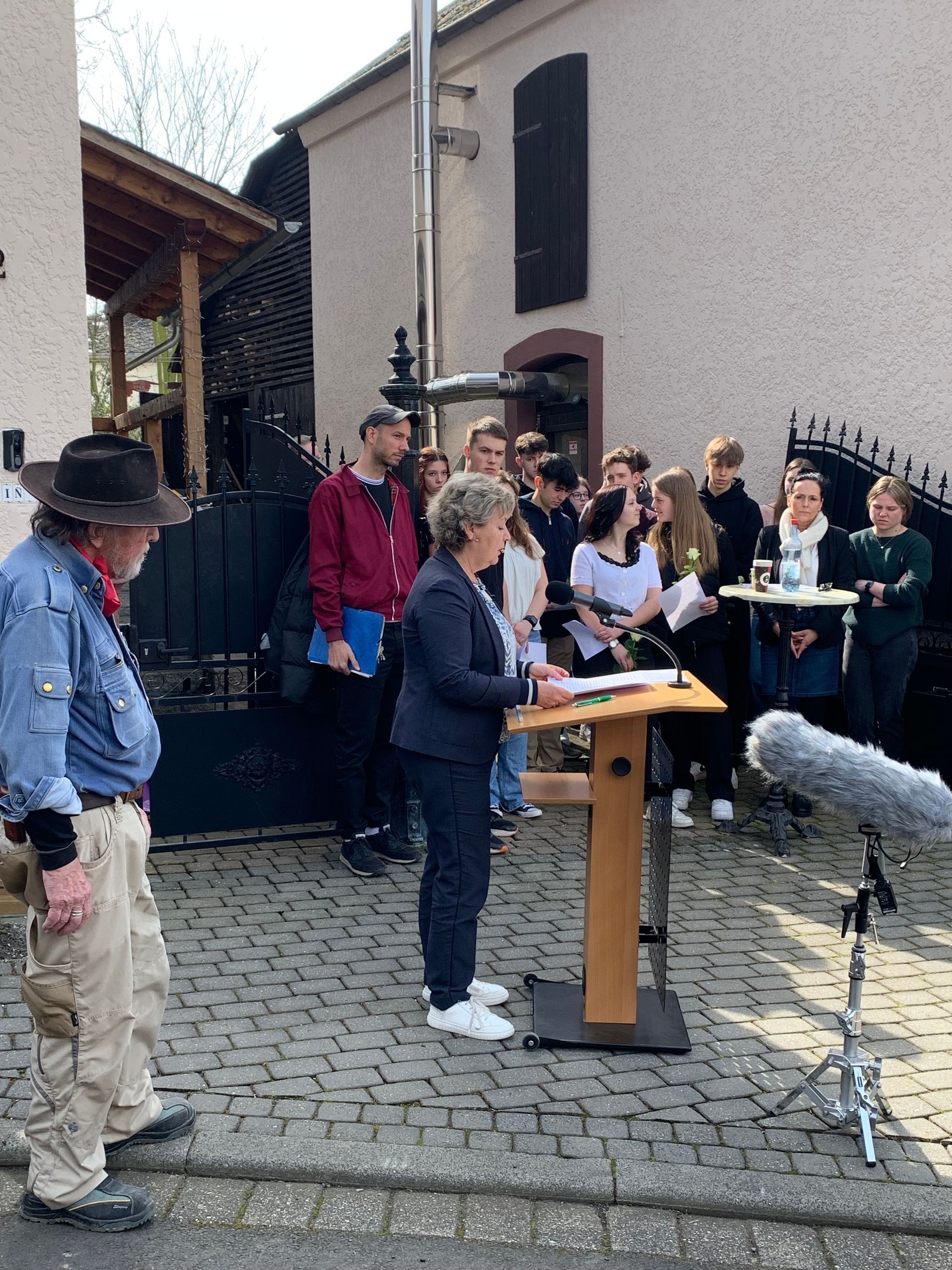 Die Feierstunde begann mit einer Rede der Bürgermeisterin Silvia Scheu-Menzer, die sich freute, dass nun auch in Hünfelden erstmals Stolpersteine an das Schicksal der jüdischen Menschen erinnern. Sie machte in ihrer Rede deutlich, wie wichtig das Erinnern und Gedenken bleibt und begrüßte alle Verwandten der Löwensteins herzlich, die den zum Teil langen Weg auf sich genommen hatten, um vor Ort bei der Verlegung dabei sein zu können.