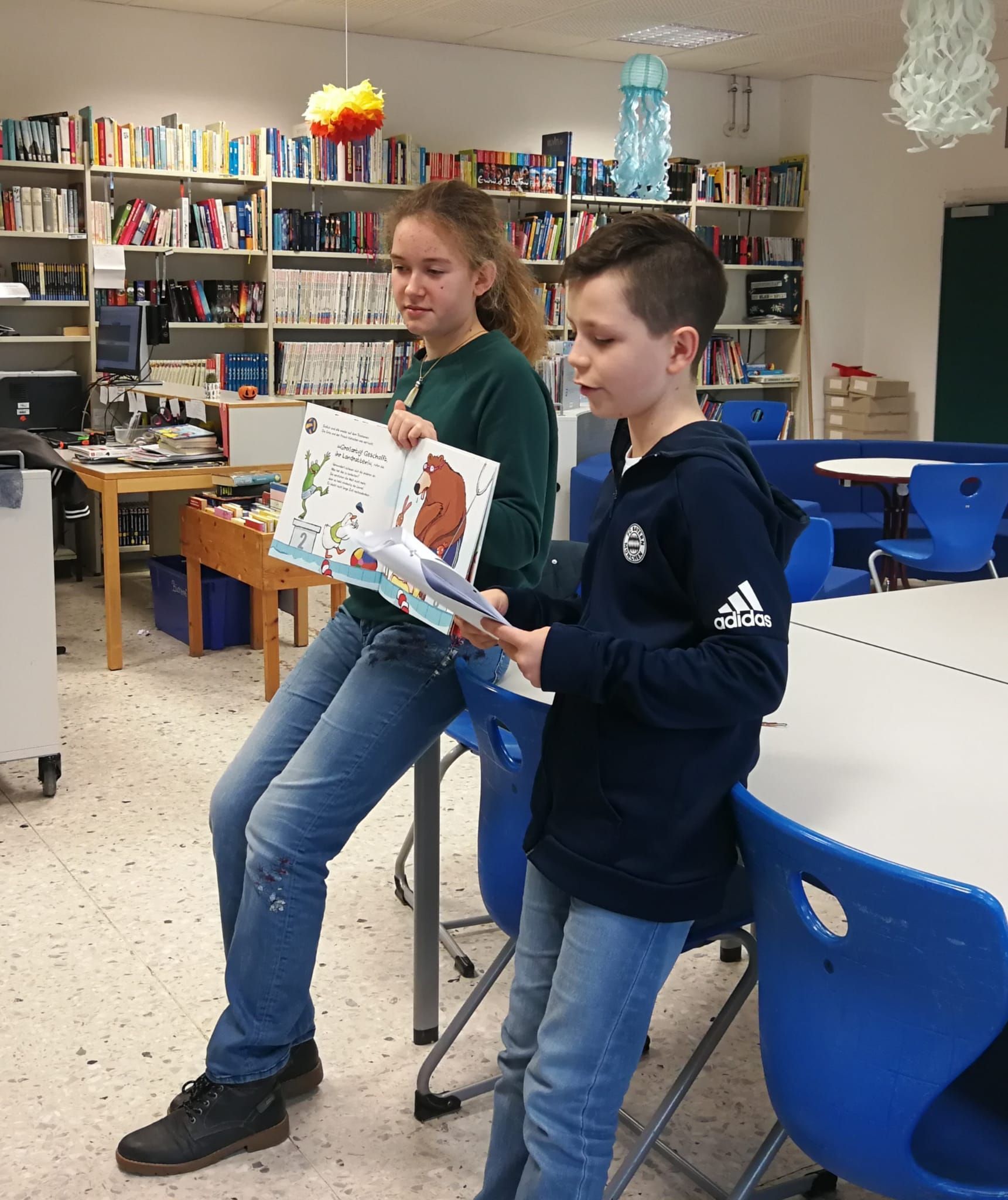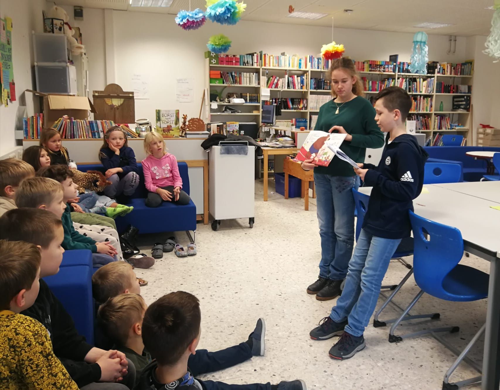 Gleich zwei Geschichten, in denen Tiere die Hauptrolle spielen, wurden von den Lesescouts Mia, Max, Johanna und Yannik am Bundesweiten Vorlesetag den Schülerinnen und Schülern der Klasse 1a vorgelesen. Wie auch in den vergangenen Jahren ist unsere Schule immer am Vorlesetag dabei und die Lesescouts, Jugendliche, die selbst gerne lesen und mit ihrer Begeisterung auch jüngere Kinder für das Lesen motivieren, präsentierten die neuen Kinderbücher „Weitsprung mit Schwein“ von Henrike Wilson und „Meerschweinchentage“ von der berühmten Autorin Cornelia Funke.