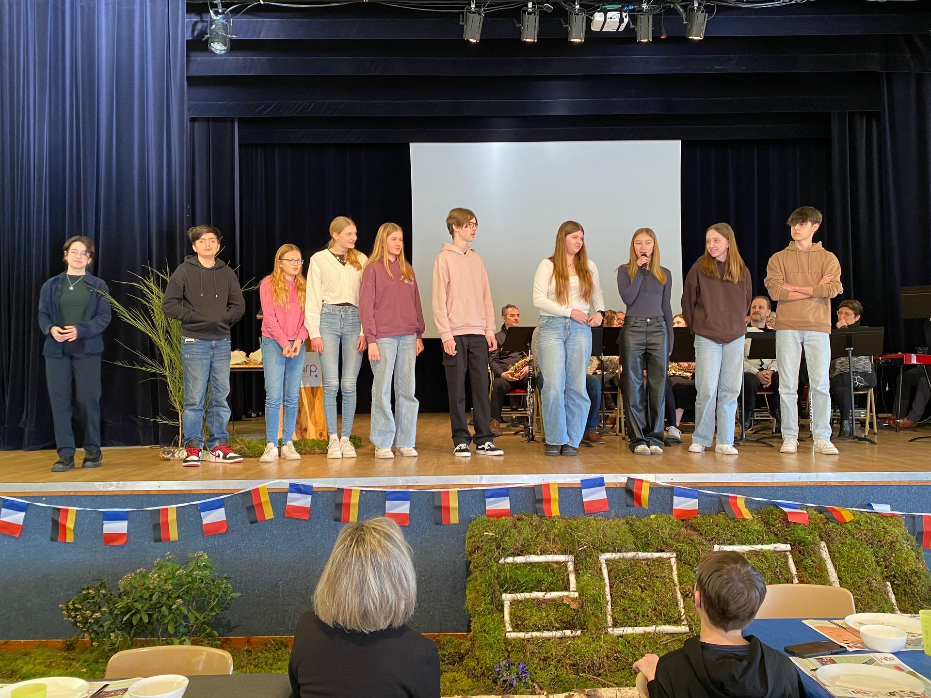 Ein Höhepunkt des Austauschs war auch in diesem Jahr das zum zweiten Mal angebotene „Deutsche Frühstück“ in Le Barp am 21. Januar. Im letzten Jahr wurde diese Veranstaltung dort erstmals anlässlich des 60. Jahrestags der Unterzeichnung des Elysée-Vertrags durchgeführt. Diesen Jahrestag nahm der Partnerschaftsverein in Le Barp erneut zum Anlass, die Freundschaft zwischen Deutschland und Frankreich in den Fokus zu rücken. Traditionell deutsche Frühstückwaren wie Brötchen, Brot, Wurst- und Käseaufschnitt, Honig, Marmelade, Müsli, Joghurt, Obst und vieles mehr wurden zum Frühstück angeboten. Nach einem musikalischen Auftakt des ortsansässigen Orchesters und kurzen Ansprachen des Vereinsvorsitzenden und der Bürgermeisterin von Le Barp Blandine Sarrazin wurde das Buffet eröffnet. Rund 150 Personen kamen in den Genuss des deutschen Frühstücks, unter ihnen auch die zehn deutschen Praktikantinnen und Praktikanten, die während der Veranstaltung auf die Bühne gebeten wurden und sich unter großem Applaus auf Französisch vorstellten.