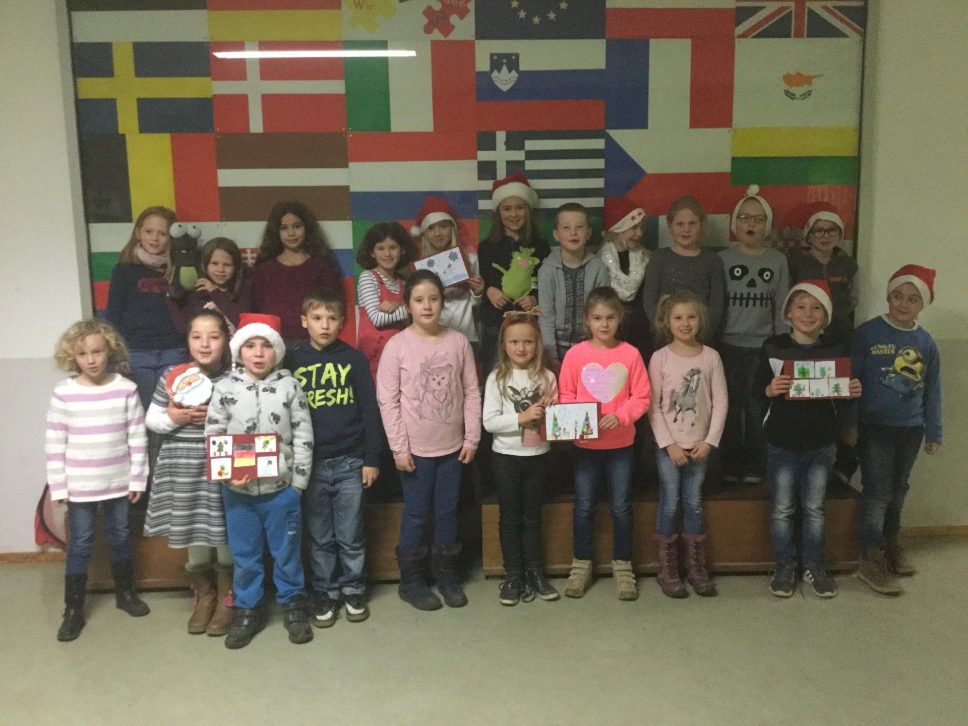 Die Klasse 2c verschickte am 10.12.19 kleine Weihnachtsüberraschungen und selbst gebastelte Karten an Schulen in Slowenien, der Tschechischen Republik, Belgien und Österreich. Die Idee zu diesem Projekt entstand während eines Kontaktseminars von eTwinning, einer Online-Plattform zur Durchführung gemeinsamer Projekte mit (europäischen) Partnerschulen bzw. -klassen. Dort lernten sich die Projektpartner kennen und schmiedeten erste Pläne zur Umsetzung des gemeinsamen Projekts: jede Klasse verschickt an jede der vier Partnerklassen einen Weihnachtsgruß, natürlich in der jeweiligen Landessprache. Im Projektbereich auf eTwinning erhalten alle teilnehmenden SchülerInnen dann bald Gelegenheit, sich anzuhören, wie die Grüße in der jeweiligen Landessprache klingen. Mit großer Freude gestalteten die SchülerInnen eigene Weihnachtskarten und bastelten kleine Rentierlollies - insgesamt mehr als 80 Stück. Nun warten alle sehr gespannt auf die Post aus den anderen Ländern.