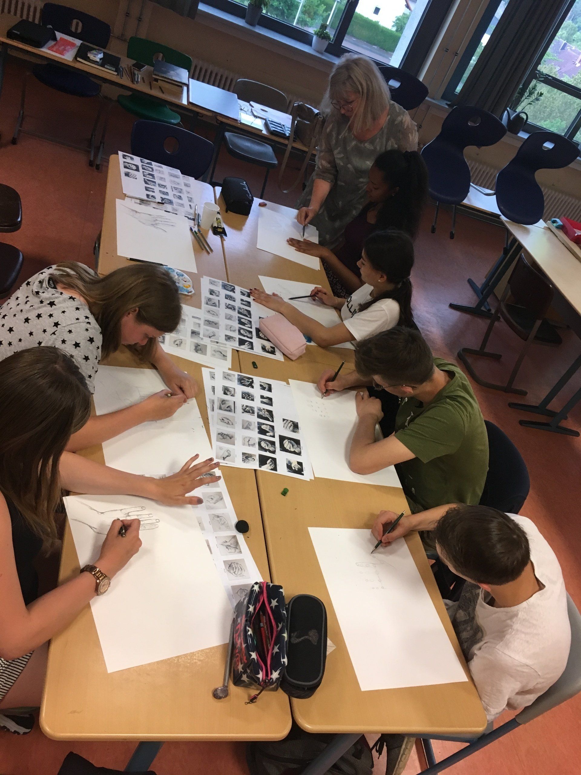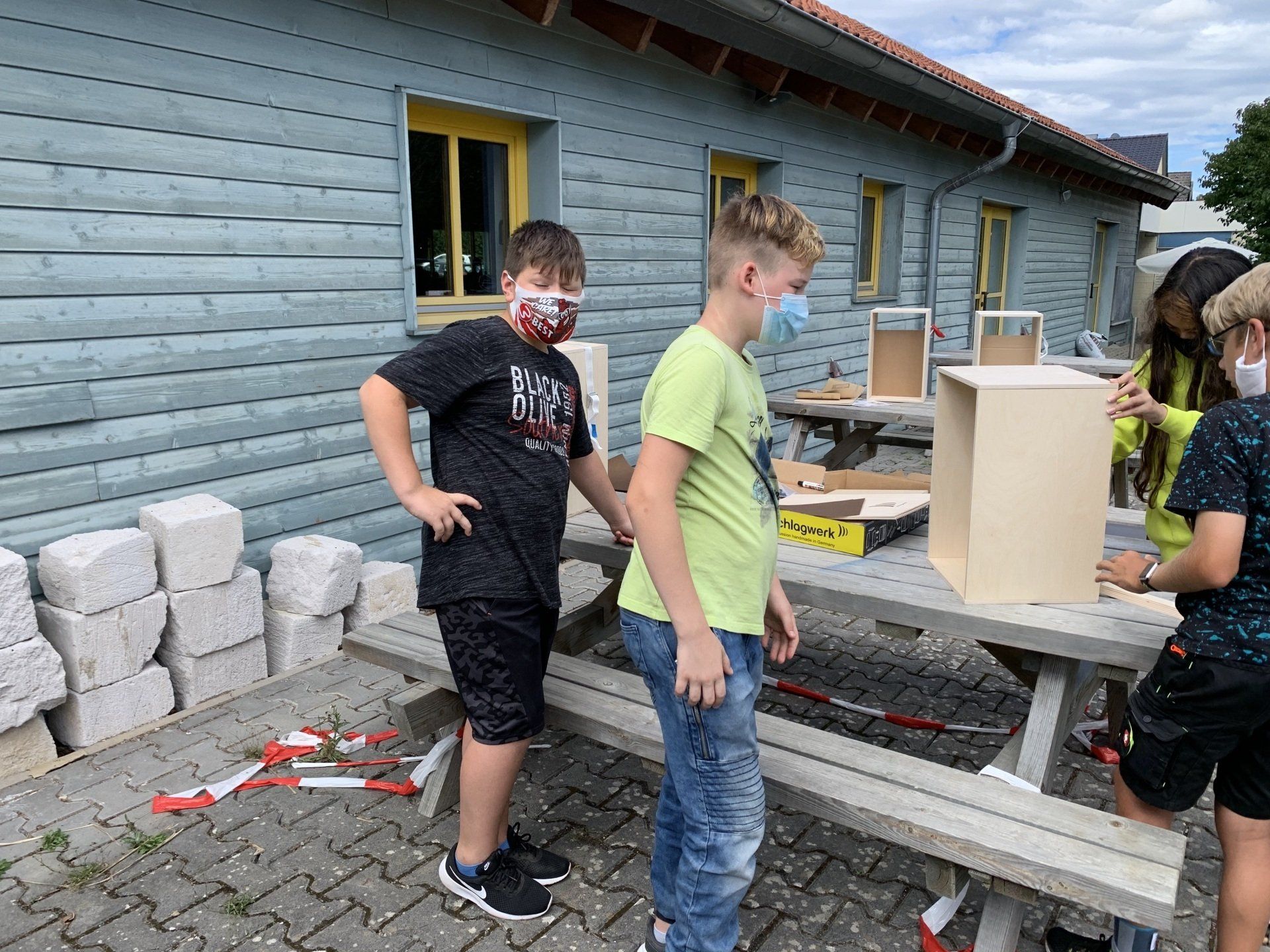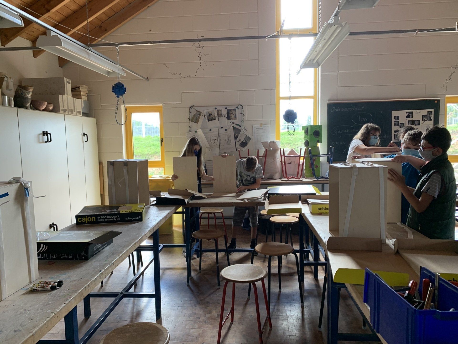 „Wir haben es geschafft“, mit diesen Worten stellte die Ganztagsklasse 6H ihre fertigen Cajons im Klassenraum auf und betrachtete sie stolz. Dass die Cajons jemals fertig werden würden, daran hatte im März niemand mehr geglaubt. Die Lieferung der 17 Bausätze, die im Rahmen eines Europaprojektes finanziert worden waren, erfolgte mitten im Lockdown, als niemand wusste, wann überhaupt Schüler*innen wieder in der Schule sein würden. So konnte mit diesem Europaschulprojekt erst in diesem Schuljahr begonnen werden und die eigentliche Planung, die Cajons nach ihrem Bau im Musikunterricht zu testen und die Spielweise richtig zu erlernen, musste über Bord geworfen werden, weil die Klasse inzwischen Kunstunterricht hat. Kurzerhand wurde beschlossen, die Cajons mit europäischen Flaggen zu verzieren. Damit diese auch gelingen, wurden für das diesjährige Europaschulprojekt „Europa deckt den Tisch“ Frühstücksbrettchen mit den europäischen Flaggen bemalt, die dann nur noch auf die Sitzfläche der Cajon übertragen werden mussten. Man sieht: Corona schränkt zwar ein, aber ermöglicht auch ganz neue Vorgehensweisen.