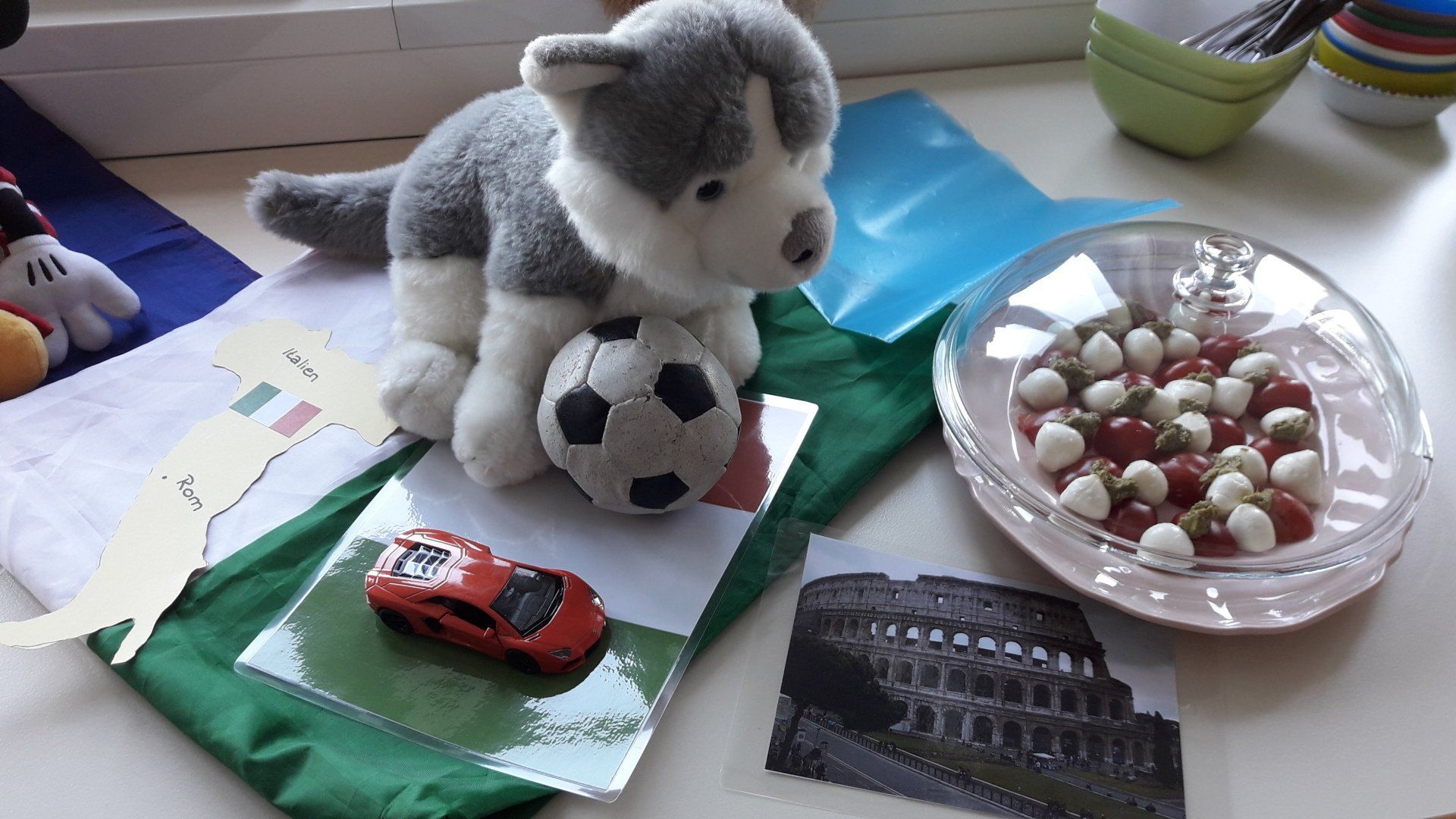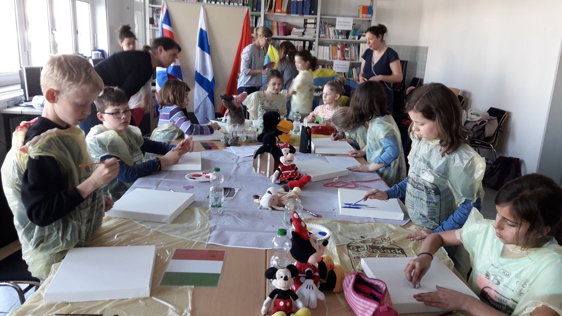 Unsere sechs Grundschüler lernten in Workshop Nr. 2 Europa mit allen Sinnen kennen. Zu jedem unserer Nachbarländer lernten sie die Hauptstadt mit berühmten Gebäuden kennen, durften eine typische Speise oder ein Getränk kosten, hörten Musik und befestigten das Puzzleteil des Landes auf einer Europakarte. Ein Rabe begleitete die Kinder auf der Reise von Land zu Land, die die Kinder jedes Mal durch die Flure wieder in den Raum zurückführte. Auch die Nachbarländer wurden durch ein Kuscheltier vertreten, das ihnen manches über seine Heimat erzählte. Am Nachmittag im kreativen Teil malte jeder mit Acrylfarben auf Leinwand zu einem der Länder. Dieses Bild nahm jeder mit und es wird alle noch lange an diesen Tag erinnern.