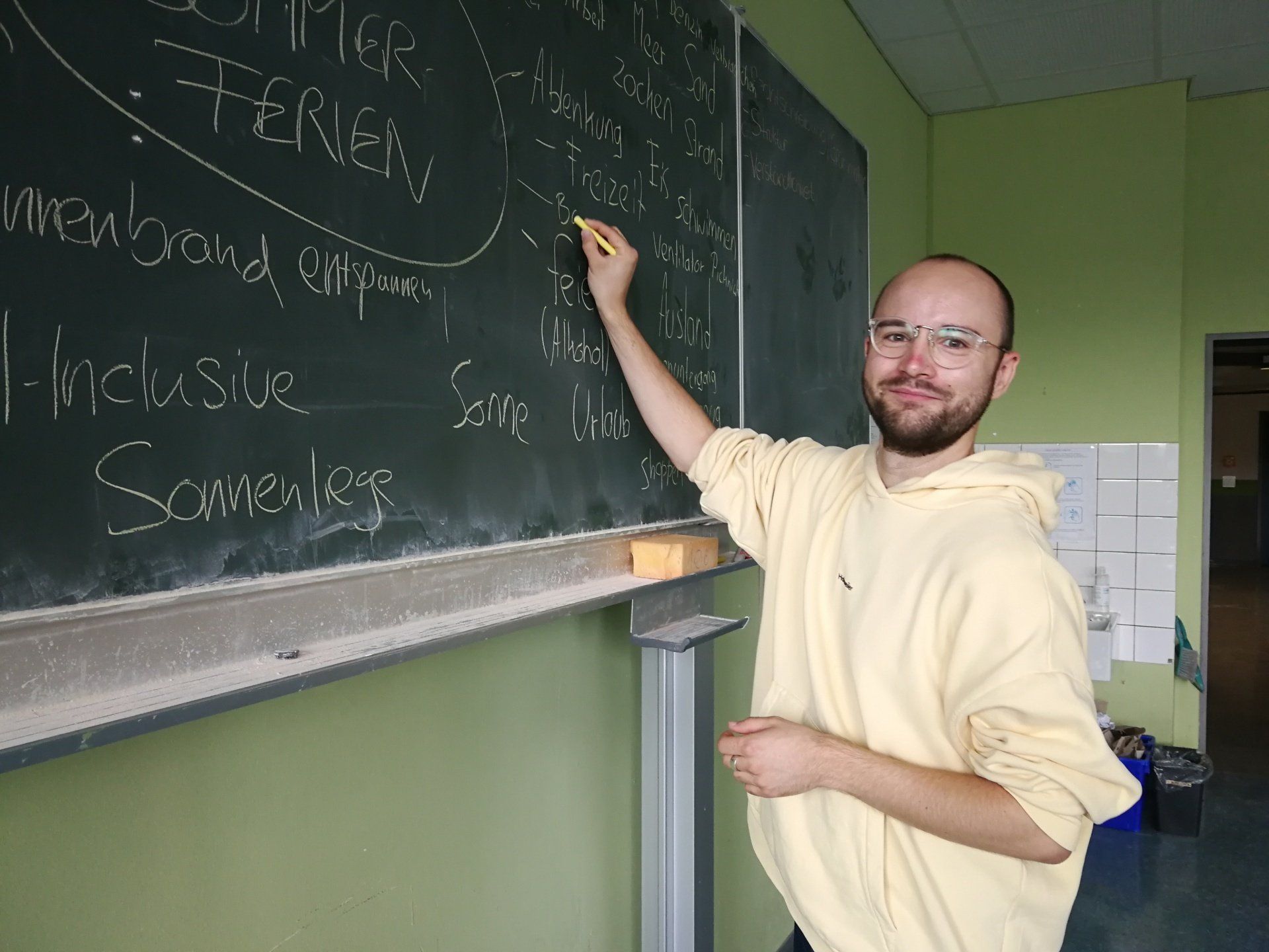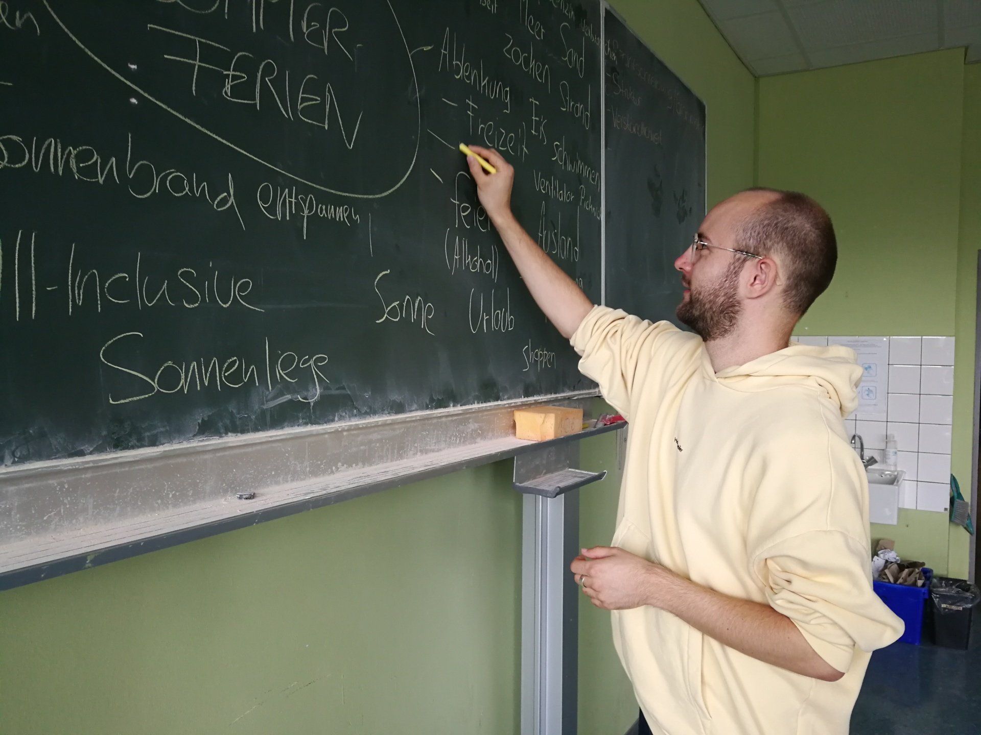Was bedeutet es, wenn man „out of the box“ denkt? Und wie können durch dieses Denken kreative Texte entstehen? In dem zwei zweistündigen Workshops mit dem Poetry-Slam-Künstler Finn Holitzka lernten die Schülerinnen und Schüler der Klassen 9Gb und 10Gb einen kreativen Umgang mit Assoziationen und mit Sprache kennen. Bereits in einem kurzen Warm-up ging es darum, schnell Assoziationen zu bilden und direkt zu äußern, woran man bei einem Begriff denkt. Schwieriger wurde es mit den Dissoziationen. Dabei sollten alle spontan ein Wort nennen, das gar nichts mit dem zuvor genannten zu tun hat. Zum Überlegen blieben gerade mal zwei Sekunden Zeit. Was es bedeutet, automatisch zu schreiben und wie man den Schreibfluss am Leben erhalten kann, konnten die Schüler und Schülerinnen direkt selbst ausprobieren. So entstanden erste freie Texte, bei denen es, ganz anders als im Deutschunterricht, nicht um die Richtigkeit von Rechtschreibung und Satzbau ging. Zum Schluss sammelte die Klasse jede Menge Begriffe zum Stichwort Ferien. Schnell füllte sich die Tafel mit Worten wie „Sonne“, „Hotel“ und „warm“. Die Aufgabe bestand dann darin, ein Gedicht oder einen freien Text über die Ferien zu schreiben, in denen all diese Begriffe nicht vorkommen. Nach einer kurzen Zeit der Überlegung sausten die Stifte über das Papier und kreative, individuelle Texte entstanden. Im Nu war die Zeit vorbei, in der die Schüler und Schülerinnen sich auf ganz andere Weise mit Lyrik und dem Entstehen von Gedichten und Texten befasst haben. Der Besuch des Künstlers, der zugleich auch unserer Botschafter gegen Rassismus ist, wurde gefördert durch Mittel aus dem Schulentwicklungsprogramm der Hessischen Europaschulen.