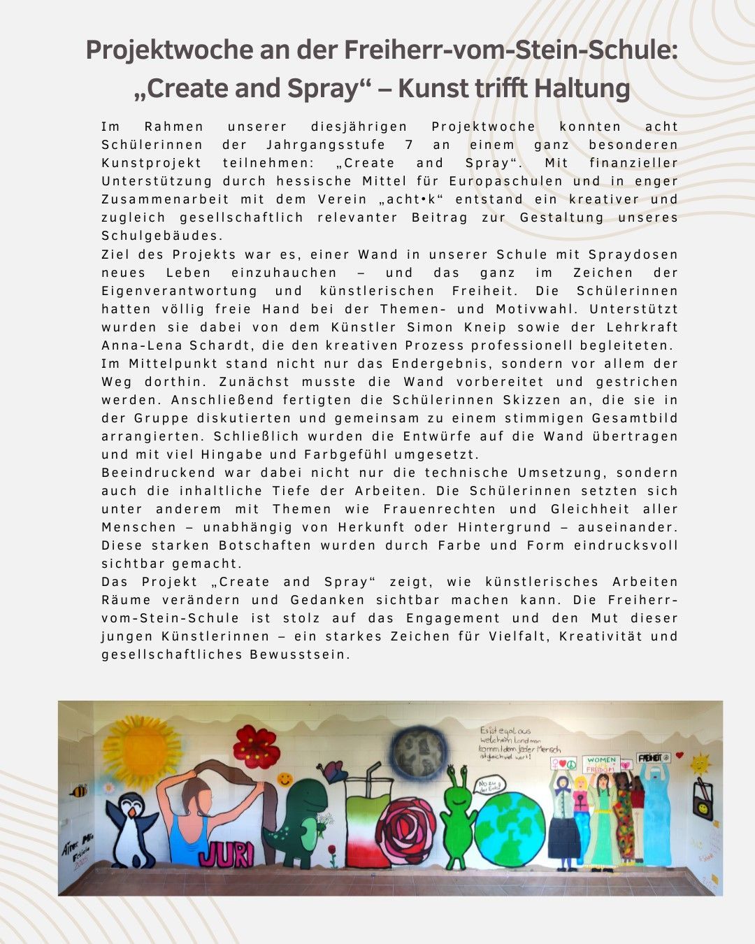Pünktlich zum Schuljahresende wurden die Bilder im Übergang von der Sekundarstufe zur Grundschule fertiggestellt und aufgehängt. Die Klasse 7Gb hat sich im Kunstunterricht bei Frau Simon im Rahmen eines Europaschulprojekts der Neugestaltung der großformatigen Bilder angenommen. Herausgekommen sind ganz unterschiedliche Auseinandersetzungen mit dem Thema „Freiherr-vom-Stein-Schule – Europaschule“.