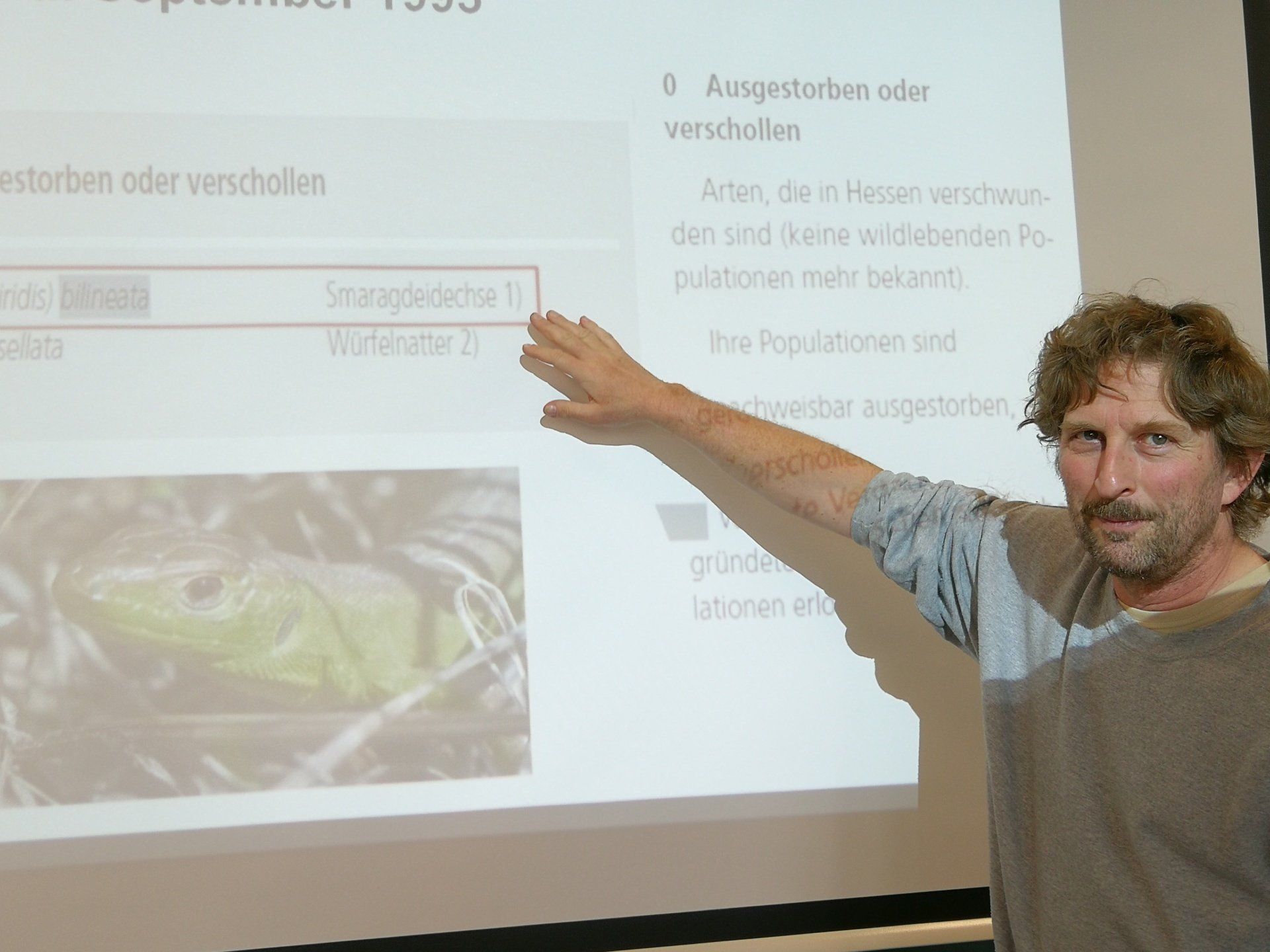 In einem weiteren Expertenvortrag referierte Thomas Fittkau vom Nabu in Bad Camberg über Tier-und Pflanzenarten unserer Heimat, die auf der Roten Liste stehen. Er zeigte anhand beeindruckender Aufnahmen, die er selbst gemacht hat, die Vielfalt der heimischen Flora und Fauna und ging zugleich auch auf ihre Gefährdung ein. Eine auffällige Flechtenart kam dabei ebenso zur Sprache wie der Schillerfalter oder die Smaragdeidechse, die es nur an einem Standort in der Nähe von Runkel gibt. Thomas Fittkau hatte auch gleich alle Roten Listen mitgebracht, sodass Schülerinnen und Schüler einen sehr anschaulichen Einblick zur Gestaltung und dem Aufbau der Roten Listen bekamen.