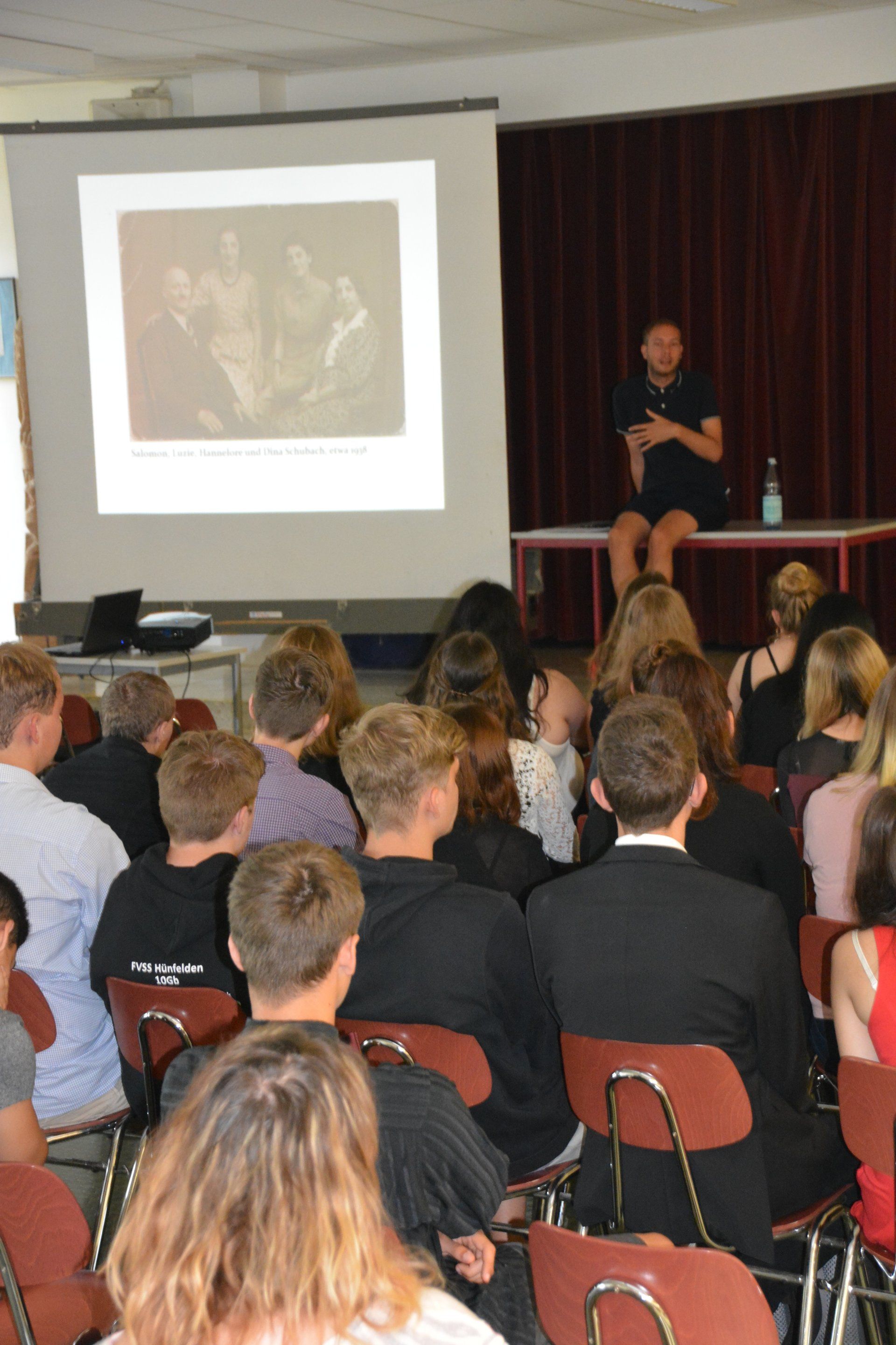 Im Mai und Juni bekam die Freiherr-vom-Stein Schule Besuch von ihrem ehemaligen Schüler Markus Streb, welcher das Erste Staatsexamen für das Gymnasiallehramt mit den Fächern Englisch und Politik abschloss. Anschließend studierte er Geschichte in Marburg. Derzeit promoviert er in Gießen zur Rolle von Männlichkeit und Weiblichkeit in Comics über den Holocaust. Sein besonderes Interesse gilt jedoch seit Jahren der Geschichte der Jüdinnen und Juden aus Mensfelden, Heringen, Dauborn und Kirberg. Im Laufe der Zeit hat Markus Streb dabei viele überraschende und erschreckende Dinge entdeckt. Mit den Nachfahren mehrerer jüdischer Familien aus unseren Dörfern steht er in Kontakt und hat einige von ihnen bereits in Israel besucht. Nun besuchte er seine ehemalige Schule, um in den Klassen 9 und 10 der Sekundarstufe jeweils drei Biografien von zwei Jüdinnen aus Dauborn und einem Juden aus Mensfelden vorzustellen und den Jugendlichen deren Einzelschicksale näher zu bringen.