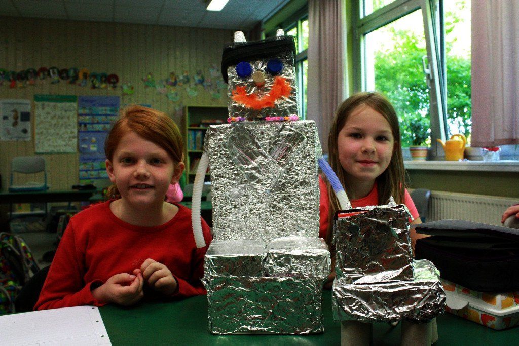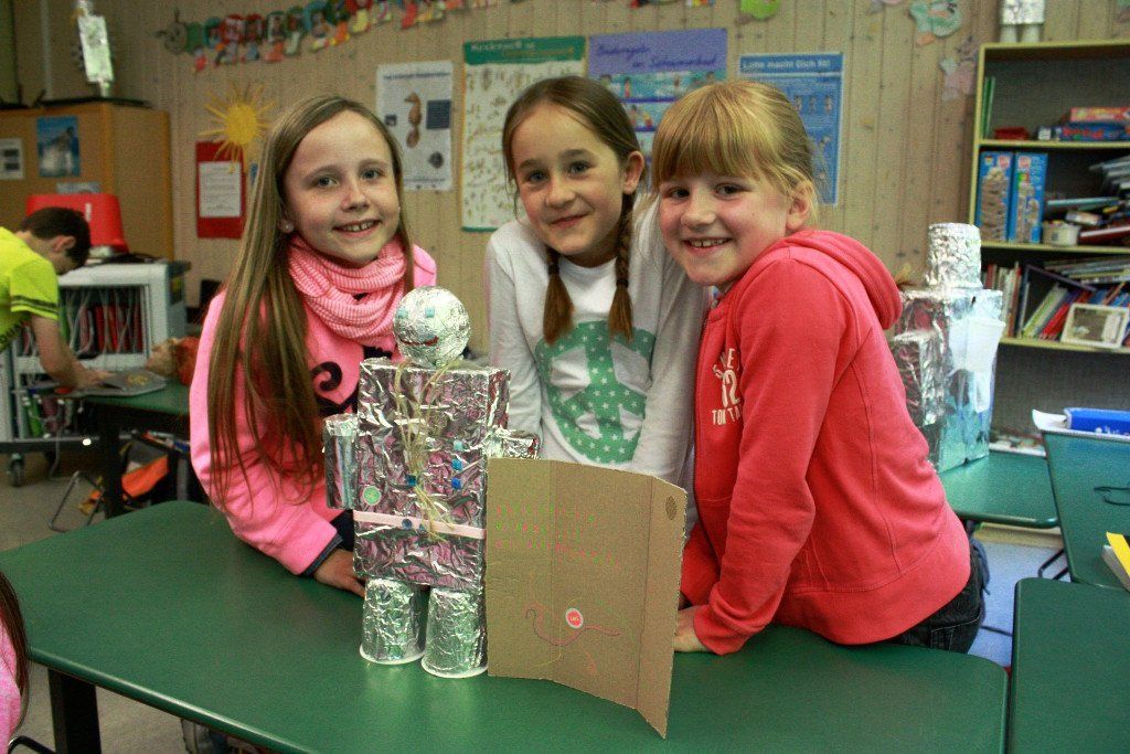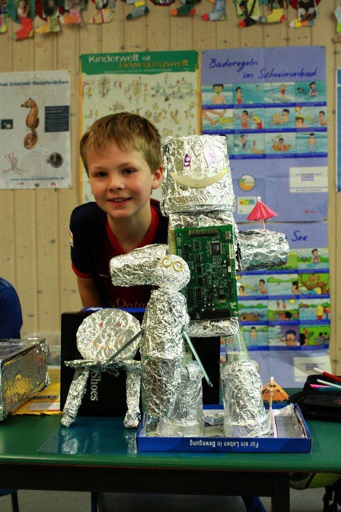 Im Kunstunterricht der Klasse 3c wurden Verpackungsabfälle zum Leben erweckt. Joghurtbecher, Pappkartons und Toilettenpapierrollen wurden mit Alufolie überzogen und zu Robotern verwandelt. Die Schüler und Schülerinnen ließen ihrer Kreativität freien Lauf und verzierten mit Knöpfen, Federn, Eisschirmchen, Kulleraugen und Glitzersteinchen ihre ganz individuellen Kunstwerke. Im Anschluss daran bekamen die Roboter ihren großen Auftritt in selbst gestalteten Comics, welche die Schüler und Schülerinnen mit ihren IPads und vielen tollen Ideen verwirklichten.